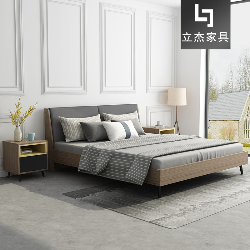 材質:標準環保E1級三聚氫氨板,防火,耐磨,防污,硬度高. 表面啞光效果持久,強度高,剛性好,不變形,比重合理,所有板材均為經防蟲防腐化學處理。人造板游離甲醛放量<9mg/100g,達到歐洲E2級標準,封邊:優質厚PVC封邊 。加厚布藝大軟包靠背,柚木色床身,排骨架